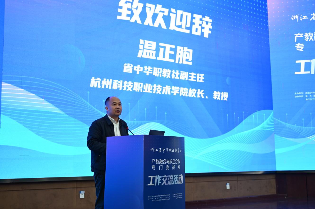 省中华职教社副主任、我校校长温正胞代表承办单位对各位领导、嘉宾的到来表示热烈欢迎,向长期关心支持浙江职业教育及学校发展的各界同仁致以诚挚感谢,并介绍了杭科院在产教融合、校企合作领域的探索实践与成效。