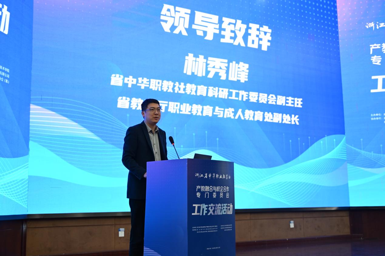 浙江省教育厅职业教育与成人教育处副处长林秀峰在致辞中强调了产教融合、校企合作对职业教育改革发展的核心意义,表达了省教育厅对相关工作的高度重视与大力支持,为浙江职业教育高质量发展注入信心。