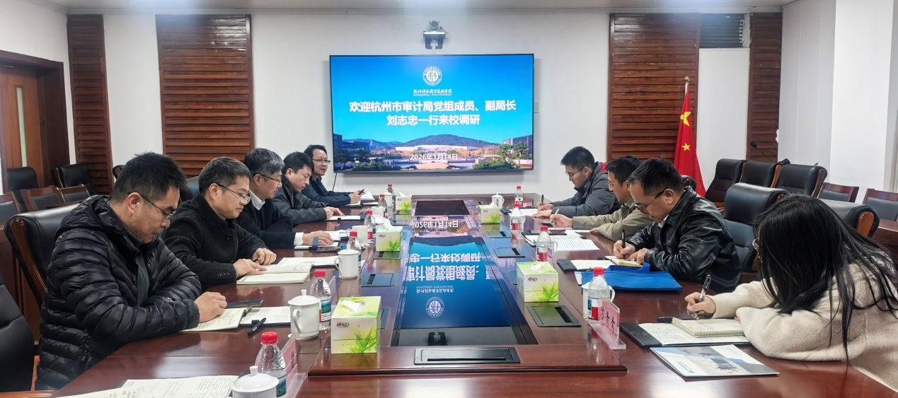 1月14日下午,杭州市审计局党组成员、副局长刘志忠一行4人来我校调研指导。党委书记范朝辉热情接待并出席座谈会。审计办、纪委办、计财处、公管处相关负责人参加。