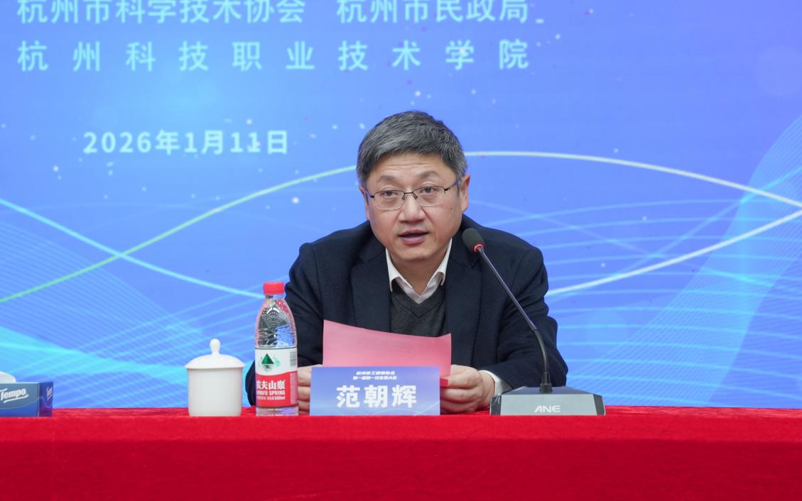 范朝辉代表发起单位讲话。他表示,杭科院作为杭州市人民政府主办的全日制普通高等职业院校,紧密对接浙江省“415X”和杭州市“296X”先进制造业产业集群布局,构建了特色鲜明的专业体系,打造了多个有影响力的产教融合平台。作为协会秘书长单位,杭科院将认真履职,全力支持协会开展学术交流、会员服务等工作。他坚信,协会必将成为助力杭州科技创新和产业创新的“智囊团”、推动校企协同发展的 “立交桥”、共育工程技术人才的“孵化器”,为杭州建设世界一流的社会主义国际大都市贡献工程智慧与力量。