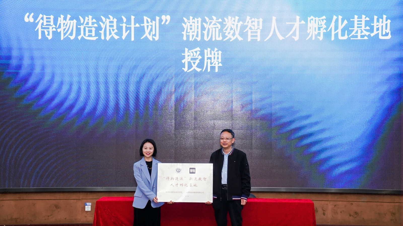 得物集团现场为杭科院授牌“‘得物造浪计划’潮流数智人才孵化基地”。该基地的落地,标志着项目核心育人阵地正式建成,未来将成为校企联合开发课程、共建师资队伍、开展实战实训、定向培育人才的核心载体,真正实现校园育人标准与产业用人需求的无缝衔接。