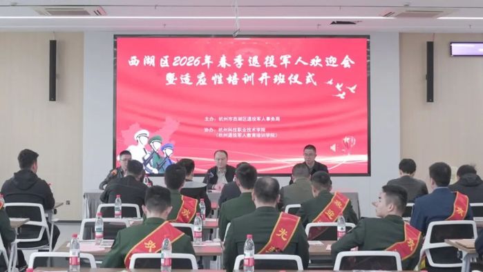 区退役军人事务局相关负责人向退役士兵致以欢迎与敬意,号召大家退役不褪色,传承部队优良作风,借助培训快速适应新环境,为西湖区发展贡献力量。退役士兵代表发言致谢,承诺永葆军人本色、奋勇争先,随后全体退役士兵集体宣誓,展现奋进向前的精神风貌。