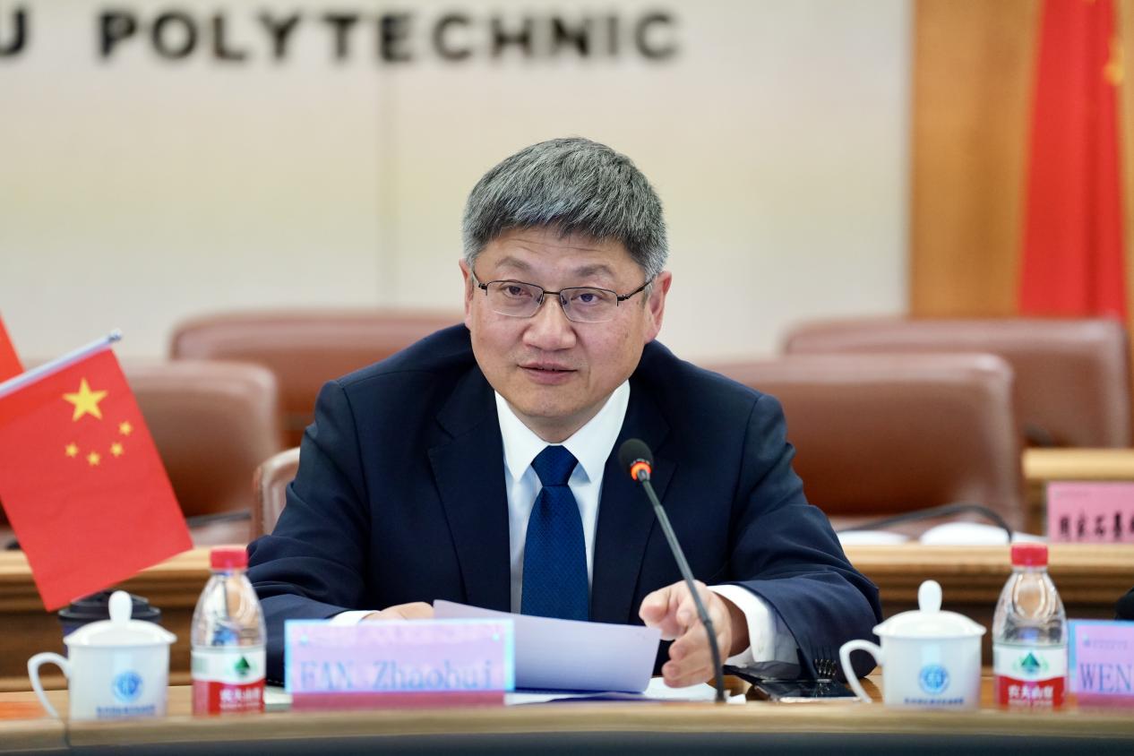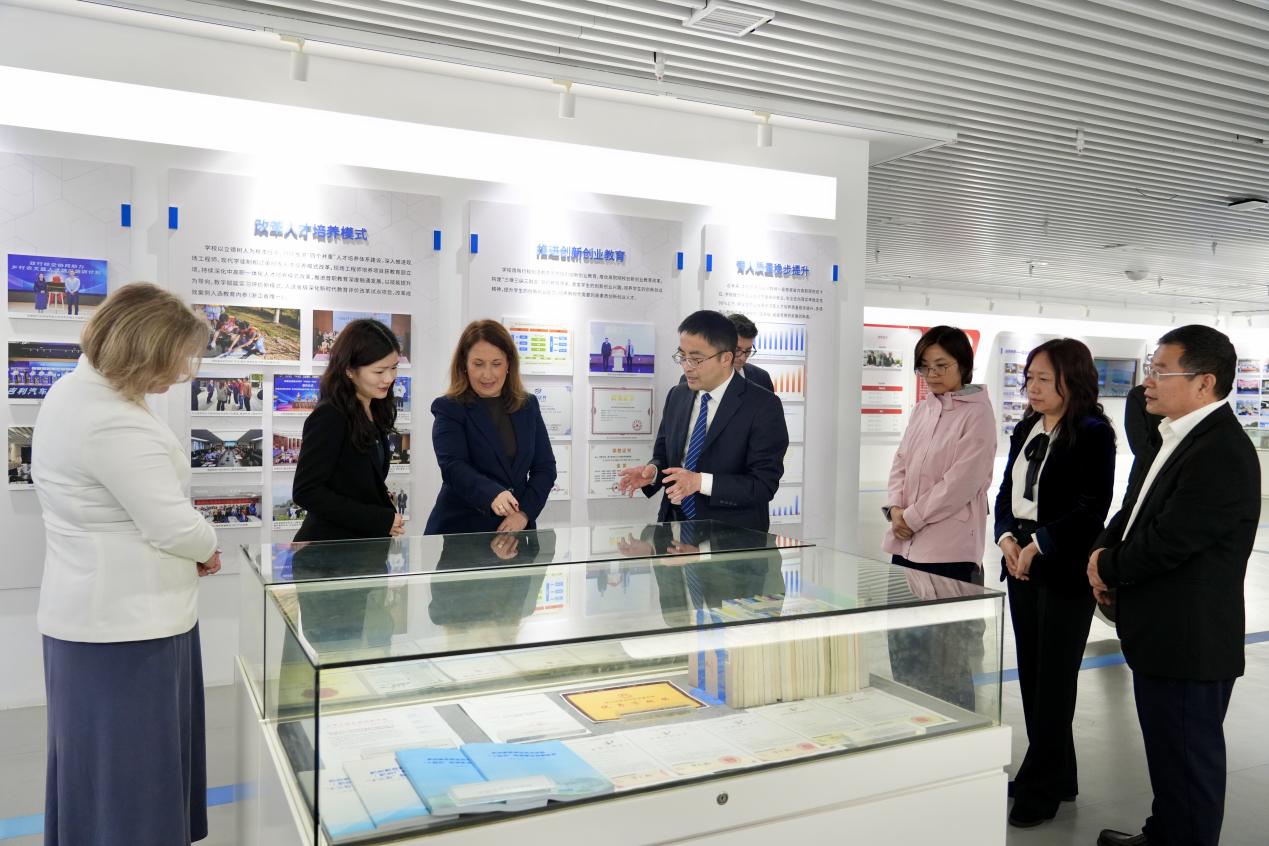 当日下午,西班牙圣乔治大学、国家石墨烯创新中心、零跑汽车、容百科技代表就国际联合实验室具体合作事项与我校汽车工程学院进行座谈交流,潘建峰出席并讲话。会上举行了动力电池工程协同创新中心签约和 “芯动力拔尖班”启动仪式,为协同育人迈出扎实一步。西班牙代表团和企业代表当日还参观了我校校史馆、汽车工程学院实训基地和阿里巴巴橙点数字经济产业学院实训基地。