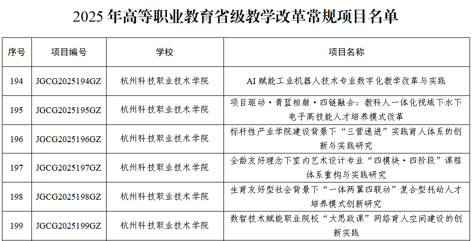 近日,浙江省教育厅公布2025年高等职业教育和高校继续教育教学改革重点项目立项名单,我校申报的2项重点项目、6项常规项目全部成功获批省级立项。此次立项成果,是我校持续推进教育教学改革、积极探索人才培养创新路径的集中体现。