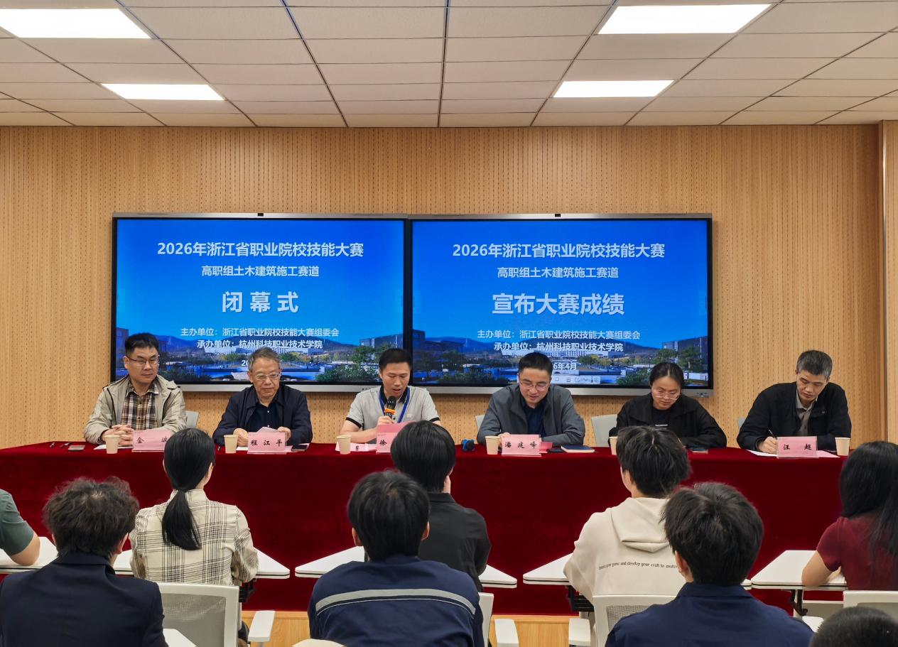 4月27日,2026年浙江省职业院校技能大赛高职组土木建筑施工赛道在我校顺利闭幕,来自全省19所高职院校的57支代表队齐聚赛场,展开了高水平技能比拼。土木建筑施工赛道专委会工作组组长程江平,杭州科技职业技术学院党委委员、副校长潘建峰,比赛裁判长徐运明出席闭幕式,行业专家及院校代表共同见证赛事成果。