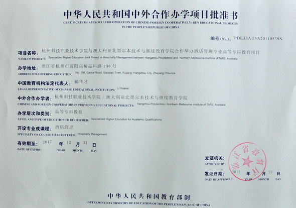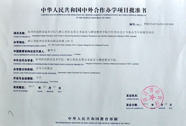 经省教育厅批准并报教育部备案,我校正式获得与澳大利亚北墨尔本技术与继续教育学院(NMIT)合作举办会计与酒店管理两个专业的资格。这是我校迄今为止获批的第一项中外合作项目。