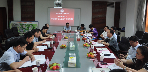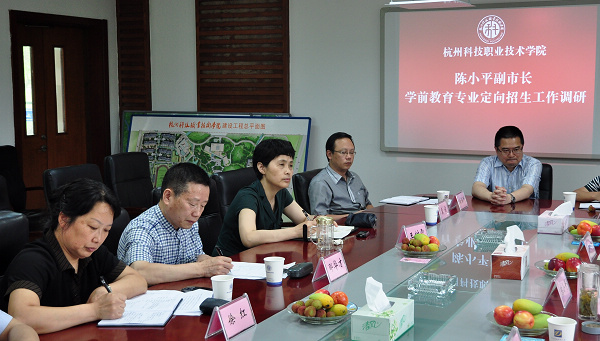 6月8日上午,杭州市副市长陈小平一行来我校专题调研学前教育专业定向招生工作。杭州市人民政府副秘书长张连水,杭州市教育局党委书记、局长徐一超,杭州市人力资源与社会保障局副局长郑建波,市政府办公厅科教文卫处处长唐奕,市教育局高教师处长孙青峰等陪同调研。校党委书记郦华才,党委副书记、副校长谢列卫,纪委书记王树霞,副校长徐红及校办、宣传部,教务处,招生就业处,教育学院、人事处等部门负责人参加座谈。