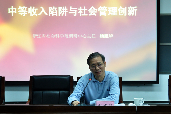 会上,杨建华主任结合当前经济社会发展的现状解读了社会管理与“中等收入陷阱”,并围绕社会管理、社会建设详细阐述了跨越“中等收入陷阱”的国际经验教训、浙江省遭遇“中等收入陷阱”的可能性社会因素,以及如何加强与创新社会管理、跨越“中等收入陷阱”三个方面的问题。他认为,要跨越“中等收入陷阱”,推进浙江顺利步入现代化地区行列,除了在经济层面继续加大市场经济体制改革力度、促进产业结构调整与升级、全面实现经济发展方式转型外,更要在社会领域做出更多的努力。杨建华主任还就吴斌案例引发了大家对价值观的讨论。