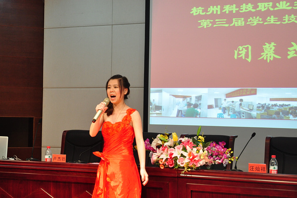 在本届技能大赛歌曲演唱技能竞赛一等奖获得者教育学院张霁云同学的悠扬歌声中,大赛组委会副主任、副校长徐红宣布校第三届学生技能大赛胜利闭幕。