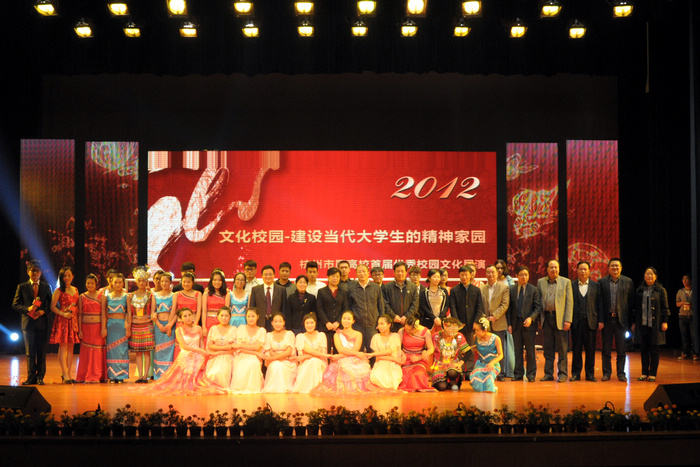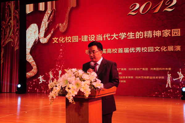 11月6日晚,“杭州市属高校首届优秀校园文化展演”活动在我校文体中心举行。杭州市委宣传部副巡视员史玉芳,杭州市教育局副局长肖锋,杭州市文广新局副局长麻捷,杭州文广集团副巡视员白奇潜,杭州市团市委学校部部长茹意,杭州市教育局高师处处长孙青峰以及杭州师范大学、浙江大学城市学院、杭州职业技术学院、杭州万向职业技术学院、浙江育英职业技术学院、杭州科技职业技术学院的校领导出席了展演活动。本次展演由杭州市教育局、杭州市文明办、杭州市文广新局、杭州文广集团、杭州市团市委主办,由我校承办。