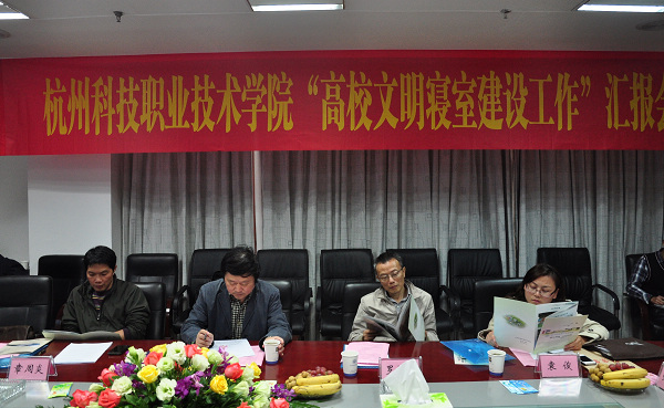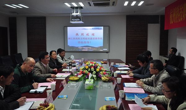11月8日下午,以中国美术学院副院长孟云生为组长,浙江大学新宇集团总裁罗树明、浙江传媒学院党委学工部部长章周炎、浙江教育发展中心滨江后勤公司办公室主任袁俊为成员的省高校文明寝室建设督查组莅临我校检查指导工作。校长傅勤,副校长徐红,学工部部长、学生处处长、招生就业处处长汪灿祥,公共管理处副处长高勇,保卫处副处长韩张尧,学工部副部长、学生处副处长、招生就业处副处长曲海洲,团委副书记周俊炯,以及浙大新宇公司张进标、丁秋生出席汇报会。