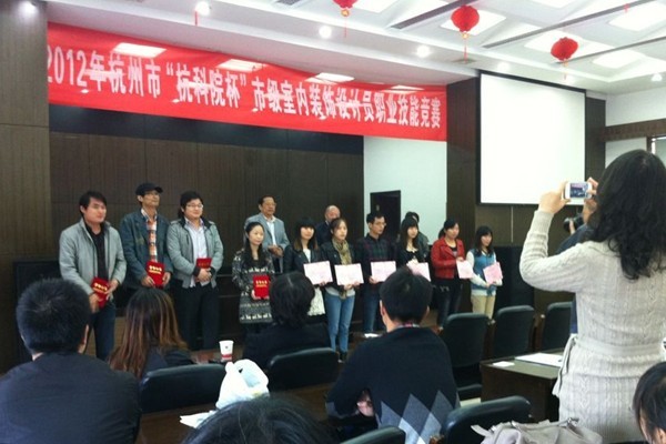 2012年11月3日,杭州市“杭科院杯”室内装饰设计员竞赛在杭州市建筑企业管理站落下帷幕。来自艺术学院建筑装饰工程技术专业的9名同学组成的三支队伍在刘淑婷、王宝东、施汴彬、洪瑛和刘庆生老师的带领下参加了比赛并取得了优异的成绩。其中吕晨伊、林海丽同学获得二等奖,彭小燕、何水萍、胡兴辉、方香同学获得三等奖。我校同时还获得优秀组织单位奖。