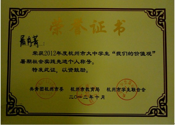 此次评比活动旨在进一步促进大中学生暑期社会实践长期化、项目化、阵地化、规范化方向深入发展。今年暑假,我校的“红色旋风”社会实践小分队走访省内多个革命教育基地,在此基础上创作拍摄的弘扬爱国主义情怀的微电影《寻》荣获浙江省大学生多媒体大赛DV类二等奖。