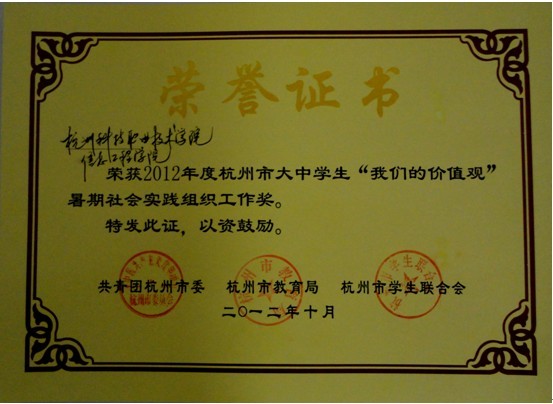近日,在由共青团杭州市委、杭州市教育局、杭州市学生联合会主办的“我们的价值观”暑期社会实践系列评比中,我校信息工程学院凭借“红色旋风”暑期社会实践小分队的出色表现而荣获“组织工作奖”,指导老师屠肖菁荣获“先进个人”称号。