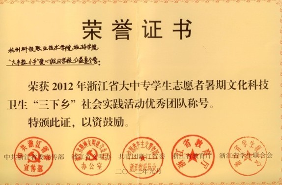 由中共浙江省委宣传部、浙江省文明办、共青团浙江省委和浙江省教育厅、浙江省学生联合会五单位联合开展的2012年浙江省大中专学生志愿者暑期文化科技卫生“三下乡”社会实践活动评选结果日前揭晓,旅游学院“大手拉小手”爱心假日学校公益夏令营荣获2012年浙江省大中专学生志愿者暑期文化科技卫生“三下乡”社会实践活动优秀团队称号。