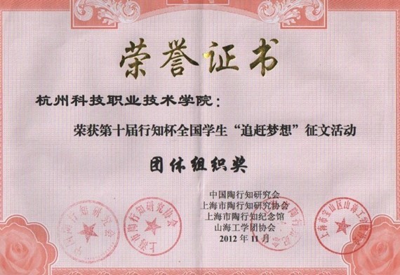 2012年12月8日,由中国陶行知研究会与上海市陶行知研究协会、上海市陶行知纪念馆、山海工学团协会联合举办的第十届行知杯全国学生“追赶梦想”征文活动颁奖仪式在陶行知的第二故乡上海宝山举行,我校荣获本届征文活动团体组织奖。校学生陶研会成员嵇莲同学以《追逐梦想》一文荣获征文活动三等奖。