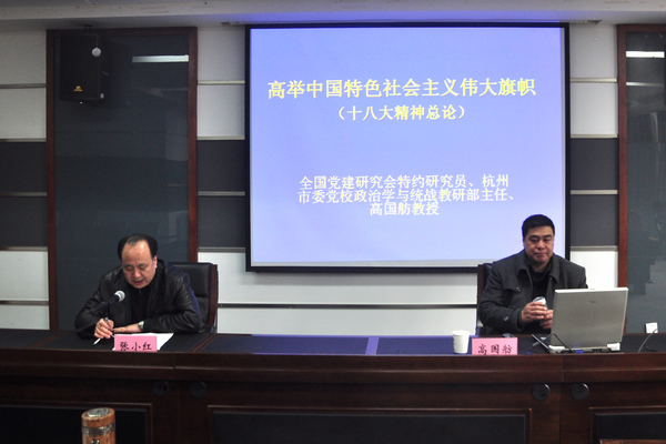 月28日下午,学校召开党委理论学习中心组扩大会议,邀请杭州市委党校政治学与统战教研部主任高国舫教授来校宣讲十八大精神。校党政领导班子全体成员、全体中层干部、各党总支和党支部书记、思政课教师代表参加学习。党委副书记张小红主持会议。