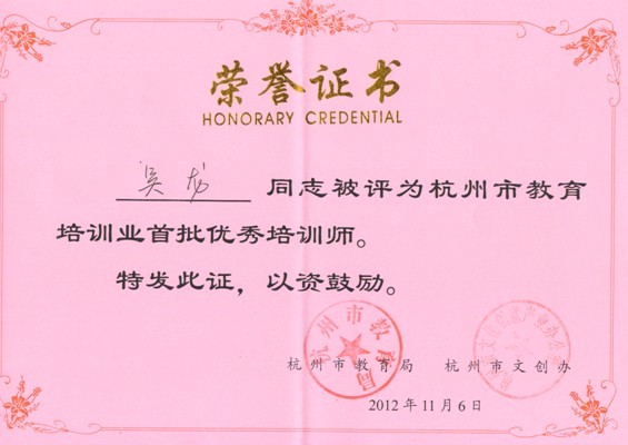 为加快培养一支优秀的青年培训师队伍,2012年10月,市教育局和市文创办面向全市教育培训业组织了首批优秀培训师的选拔工作。经学校推荐和专家评审、结果公示,市教育局、市文创办审定,我校信息工程学院教师吴龙被评为杭州市教育培训业首批优秀培训师。