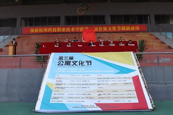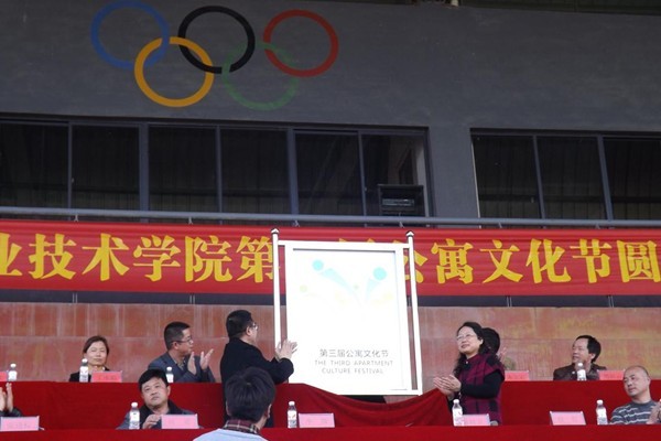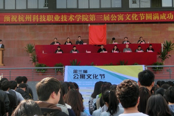 谢列卫校长和徐红副校长共同为本届公寓文化节节徽揭幕,并由谢校长宣布杭州科技职业技术学院第三届公寓文化节开幕。