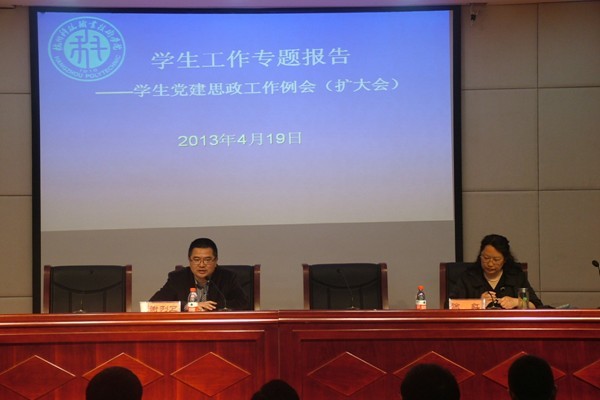 4月19日下午,我校在陶研馆报告厅召开学生党建思政工作专题扩大会议,校长谢列卫作学生工作专题辅导报告,党办、宣传部、组织部、保卫处、工会负责人,学生处(招就处、团委)全体人员,各党总支书记、全体辅导员、思政课任教师,新宇公司负责人等参加,会议由副校长徐红主持。