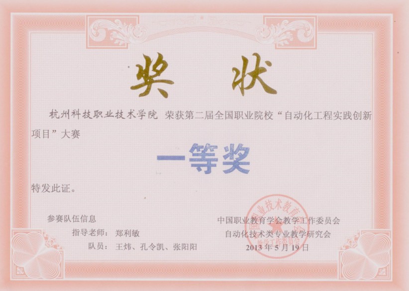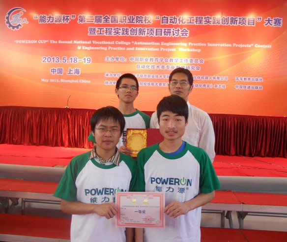 2013年5月18日至19日,由中国职教学会教学工作委员会自动化技术类专业教学研究会主办的“能力源杯”第二届全国职业院校“自动化工程实践创新项目”大赛在上海电子信息职业技术学院隆重举行,来自全国十一所高职院校的十四支代表队参赛。信息工程学院电气2011级王炜、孔令凯和物联网2011级张阳炀在郑利敏老师指导下组队参赛,最终摘得桂冠。