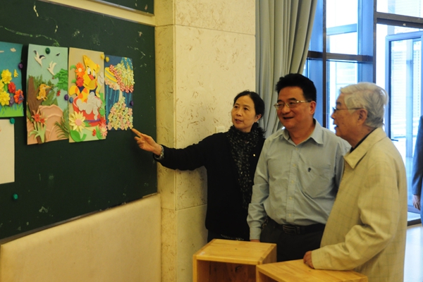 在傅勤书记的陪同下,顾明远先生参观了教育学院的行知园,考察了学院文化建设情况。教育学院院长朱丽丽、党总支书记蔡樟清向顾明远先生汇报了《幼儿园教育环境创设与玩教具制作》课程的设计与实施情况。看了“菊花”、“三只小鸟”、“小鱼儿”等学生制作的精美又富有童趣的教具,顾明远先生不断点头称赞,希望未来的幼儿教师能“在游戏中学习,在活动中成长”。