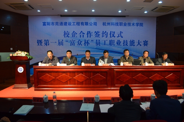 2014年11月14日下午,我校与富阳市苑通建设工程有限公司签订了紧密型校企合作协议。富阳市住房和城乡建设局局长杨宏道、富阳市常绿镇人民政府党委书记徐春龙、富阳市苑通建设工程有限公司董事长胡金平出席签约仪式。我校副校长何树贵代表学校与富阳市苑通建设工程有限公司现场签订了紧密型校企合作协议。