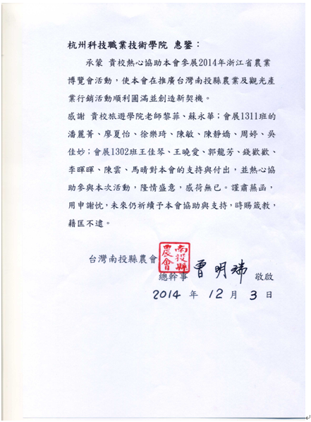 11月21日至25日,2014浙江农业博览会在浙江新农都会展中心和杭州和平国际会展中心同时举行。受省台办邀请,我校旅游学院会展策划与管理专业14名学生前往杭州和平国际会展中心场馆为台湾南投县农会提供了为期五天的展会服务,协助其开展展品营销。同学们热情、周到、专业的服务得到了省台办、台湾南投县农会的一致认可。为此台湾南投县农会特地向我校寄发了致谢函。