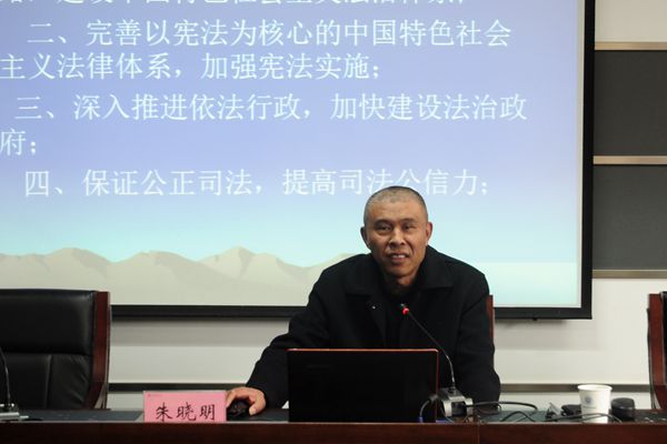 会上,朱晓明从全面推进依法治国的重大意义、紧迫性和指导思想,全面推进依法治国的总目标和原则,全面推进依法治国的重大任务三个方面入手,深入翔实地对党的十八届四中全精神实质进行了解读,为与会人员深入学习贯彻十八届四中全会精神进行了理论指导。