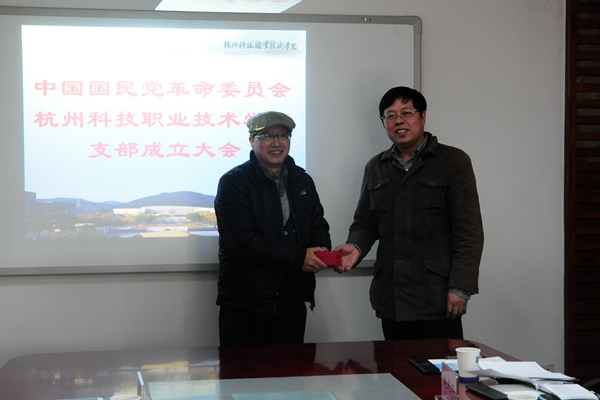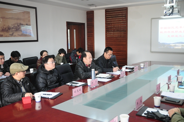 会议由方方副主委主持。民革杭州市委会组织宣传处处长杨梁宣读“民革市委会关于民革杭州科技职业技术学院支部委员会成立”批文,并举行了授章仪式。我校刘逸鹤教授代表新支委表态发言。民革教育支部主委、杭州教育局成人教育研究室副主任韩良处长代表民革杭州市委会教育支部对民革杭科院支部的成立表示祝贺。