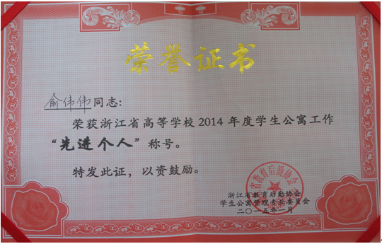1月16日,2014年浙江省教育后勤协会学生公寓管理专业委员会年会在浙江广厦建设职业技术学院召开,我校翠苑校区公寓3号楼管理员倪淑花和王素珍被评为“浙江省高等院校学生公寓工作2014年度先进班组”,高桥校区学生公寓综合服务主管俞伟伟被评为“浙江省高等学校2014年度学生公寓工作先进个人”。