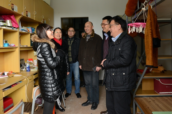 在桂园、梅园,校领导一行先后深入到多个学生寝室,看望一早返校的同学。住在梅园B104号寝室的小潘,是工商学院财务专业的学生,校领导的到来,给他带来了意外的惊喜。在得知小潘即将进入大二下学期学习生活时,傅勤书记关切地询问了小潘的毕业规划,小潘腼腆地表示,目前已有就业意向,暂不考虑继续学习深造。傅书记点头表示赞同:“财务专业是一个经验累积性行业,要工作过一段时间后才会对这个专业有较为深入的理解。”虽然认同小潘先就业积累能力的想法,但傅书记仍耐心嘱咐:在理论和知识更新速度越来越快的时代,即便参加工作了,也不能忘了学习,一定要不断更新知识,与时俱进。