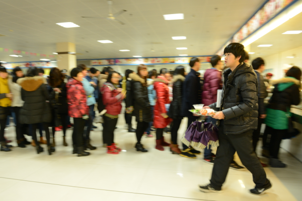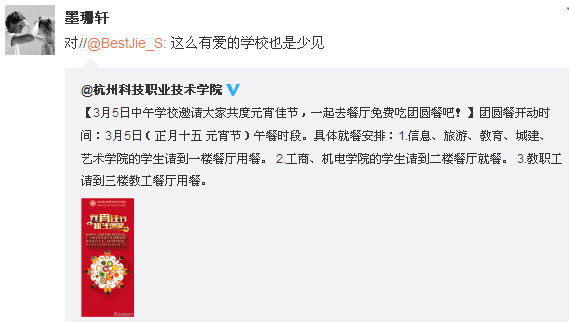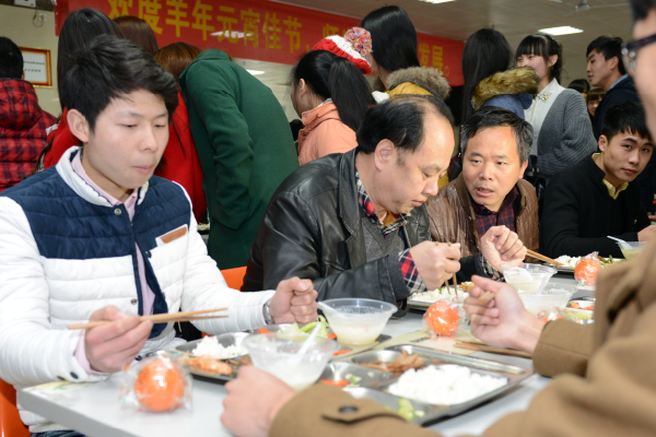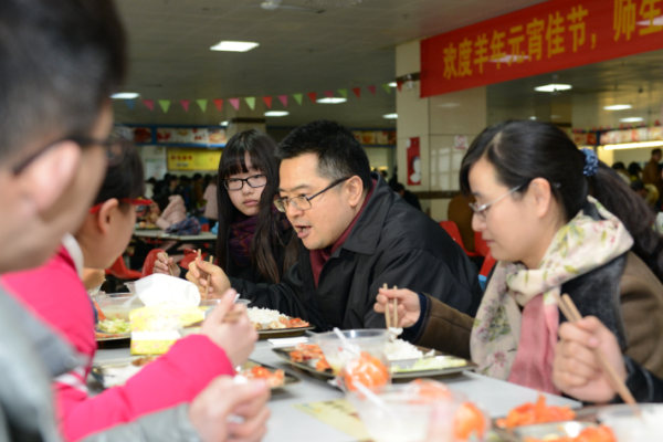 用餐期间,老师、同学边吃边拍照上传微信、微博。有学生在微博里自豪地感叹说:“这么有爱的学校真是少见!”虽然当天领餐队伍快排出食堂门口了,但许多同学表示,这么团圆喜气的日子多等一会儿也是值得的。(蔡欣欣)