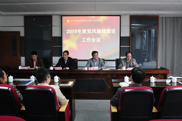 4月21日下午,我校召开2015年党风廉政建设工作会议。市委教育工委委员、市纪委驻教育局纪检监察组组长朱利民、副主任徐小明出席会议,全体校领导、处以上干部、各党总支纪检委员、重岗重职人员等共90余人参加会议。