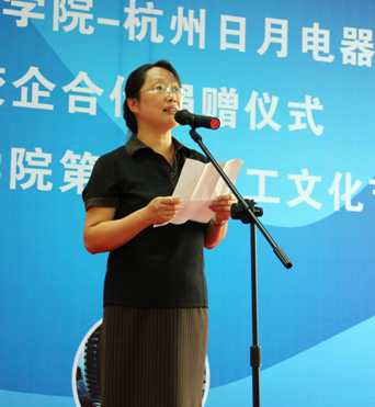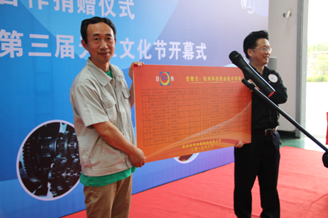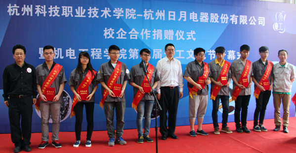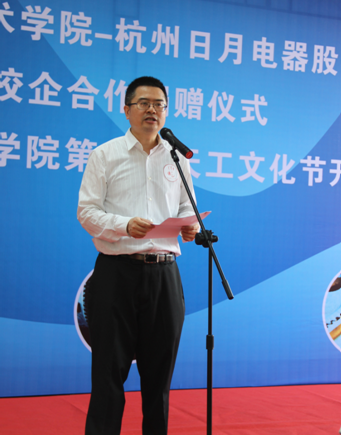 2015年6月12日上午,杭州日月电器股份有限公司校企合作捐赠仪式暨“天工”文化节开幕式在机电工程学院实训基地隆重举行。杭州日月电器股份有限公司董事、副总经理冯小定,我校校长谢列卫、副校长徐红出席仪式,机电工程学院及相关部门负责人参加仪式。