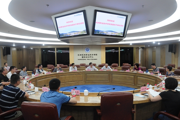 6月15日下午,杭州职业技术学院党委书记安蓉泉、校长贾文胜、党委副书记赵一文、副校长张洪宪、副校长许淑燕、纪委书记陈泉淼、副校长陈加明率党办、院办、组织部、宣传部负责人来我校交流访问。我校党委书记傅勤、校长谢列卫率校领导班子全体成员接待了杭职院一行。