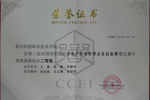 6月26日至28日,第三届全国高职院校房地产经营管理业务技能大赛暨2014-2015年中国高职院校房地产经营与估价专业行业影响力排行榜50强发布会在南京工业职业技术学院举行。由我校城市建设学院房地产经营与估价专业1301班李静怡、王倩,1302班徐敬三位同学组成的代表队顽强拼搏,经过激烈角逐,以优异成绩取得大赛二等奖。吕正辉、刘永胜、田明刚担任此次参赛队指导教师。同时,我校房地产经营与估价专业一年来在“专业人才培养水平”、“为行业开展培训服务”、“专业学术水平”和“组织或参加行业重大活动”等指标上表现出色,在全国251个房地产专业中脱颖而出,在2014-2015年中国高职院校房地产经营与估价专业行业影响力排行榜50强中名列前十。