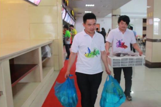 5月28日,是正式开始比赛第一天,大赛的开幕式也在这一天举行。早上7:00,志愿者们已经准备妥当,在文体中心等候各参赛队伍的到来。参赛选手到达后,开始引领队员热身、领水、检录以及准备开幕式。志愿者们干劲十足,一个平时看起来弱不禁风的女孩子,抬起一大箱水居然显得丝毫不费力,真是深藏不露。第一天比赛结束时,已经晚上8点多,有些志愿者才开始去吃晚餐,在一天辛勤工作后,享受片刻轻松。