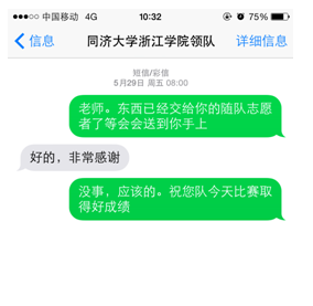 5月29日,比赛第二天,又是13个小时的志愿服务时间,直到晚上八点钟比赛结束将最后一个代表队送上回酒店班车,一天的志愿服务才算是结束了。正在大家准备去休息时,有志愿者向负责人反映将重要文件落在班车上了。负责人在第一时间联系了老师,再由老师联系了车队的队长。最后,车队队长对每一辆车进行检查,在一辆车子的椅背上找到了丢失的文件。当负责人把这个消息告诉该领队老师,老师激动地说:“实在是太感谢你们了”。