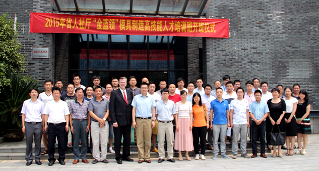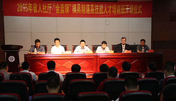 7月15日上午,由浙江省人力资源和社会保障厅主办、我校承办的2015浙江省“金蓝领”模具制造高技能人才培训班在我校陶研馆报告厅举行开班仪式。浙江省人力资源和社会保障厅职业能力建设处副处长洪在有,我校校长谢列卫,机电工程学院院长罗晓晔、党总支书记陈建松、副院长蒋水秀,外籍教师代表、国内专家代表以及我省企业和职业院校的30名优秀技术工人和教师出席了本次开班典礼。