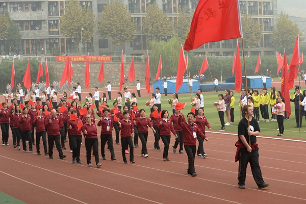 在激昂的运动员进行曲声中,护旗手迈着有力的步伐护送鲜艳的五星红旗步入田径场。21支师生代表队踏着青春的步伐依次走过主席台。入场式结束后,还举行了师生广播操比赛,场面宏大。本届运动会将持续两天,21支代表队的运动员将参加34个项目的角逐。教工趣味运动会也在同期举行,共设乒乓球、跳绳、拔河及亲子活动等10个项目。其中,亲子活动是今年新增加的教工趣味项目,包括亲子共读好温馨、亲子动手好创意、亲子陪伴好开心、亲子携手比一比等活动。