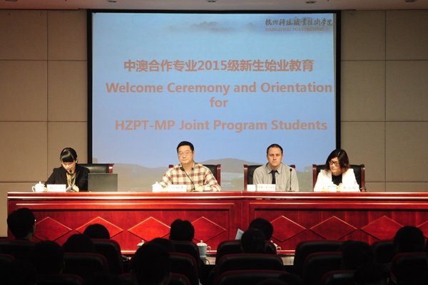 校办(外事办)、学生处、教务处、国际教育交流中心、工商学院、旅游学院相关人员,中澳合作项目外教Eric Courier、Susan Ventnor、Chris Mcardle,2015级中澳合作专业新生参加了此次始业教育。
