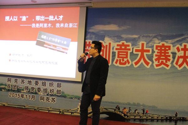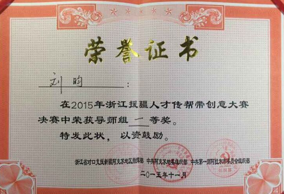 近日,又从新疆传来好消息,刘昀老师在杭州援疆人才传帮带创意大赛上,获得全场总分第一的好成绩,并代表杭州援疆指挥部参加由省援疆指挥部和阿克苏地委组织部、一师党委组织部联合主办的2015年浙江援疆人才传帮带创意大赛决赛,并再次以全场最高分夺得省赛导师组一等奖。在决赛上,刘昀老师阐述了他对传帮带工作的想法、计划、举措,及他的实践探索感悟。(浙江援疆网报道了本次比赛的详情,报道链接: http://zjnews.zjol.com.cn/system/2015/11/30/020933815.shtml)