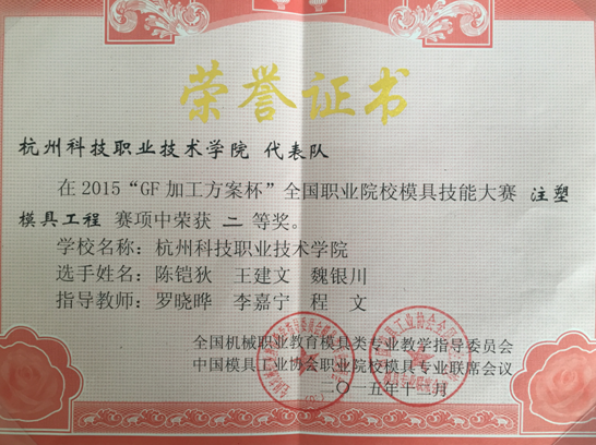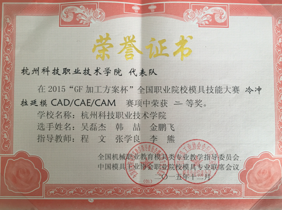 12月5日至7日,2015年全国职业院校模具技能大赛在江苏信息职业技术学院举行。我校机电工程学院模具1424班俞建东、模具1412班林吉航、模具1312班吴恩宇在罗晓晔、程文、谭小红老师的指导下荣获了大赛“注塑模具CAD/CAE/CAM”项目一等奖;模具1423班吴磊杰、韩喆、模具1424班金鹏飞在程文、张学良、李熊老师的指导下荣获“冷冲拉延模CAD/CAE/CAM”项目二等奖;模具1312班陈铠狄、魏银川、模具1412班王建文在罗晓晔、李嘉宁、程文的指导下荣获“注塑模具工程”项目二等奖。