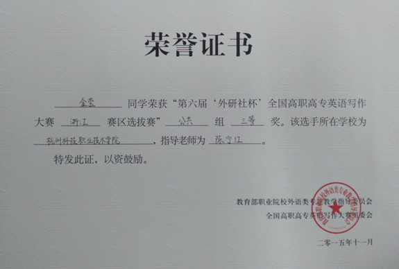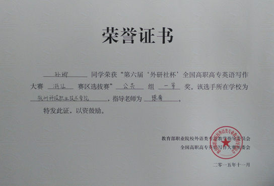 近日,第六届全国“外研社杯”高职高专英语写作大赛浙江赛区选拔赛成绩揭晓,我校信息工程学院计算机类1446班孙卿同学荣获比赛一等奖,工商学院商务1422班金莹同学荣获三等奖。
