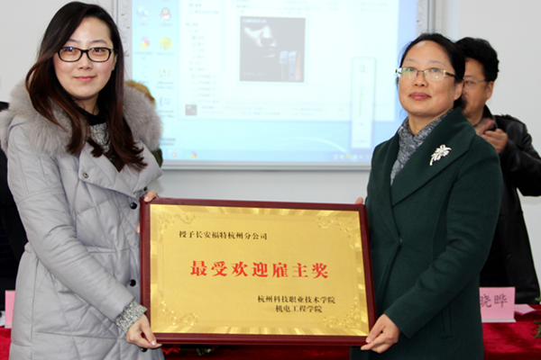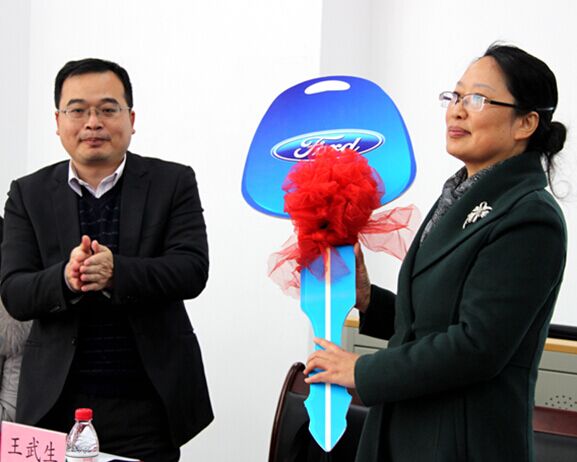 王武生总监与徐红副校长进行了捐赠车辆交接仪式。徐红副校长为长安福特杭州分公司颁发机电工程学院最受欢迎雇主奖,并宣布长安福特杭州分公司“订单班”正式开班。