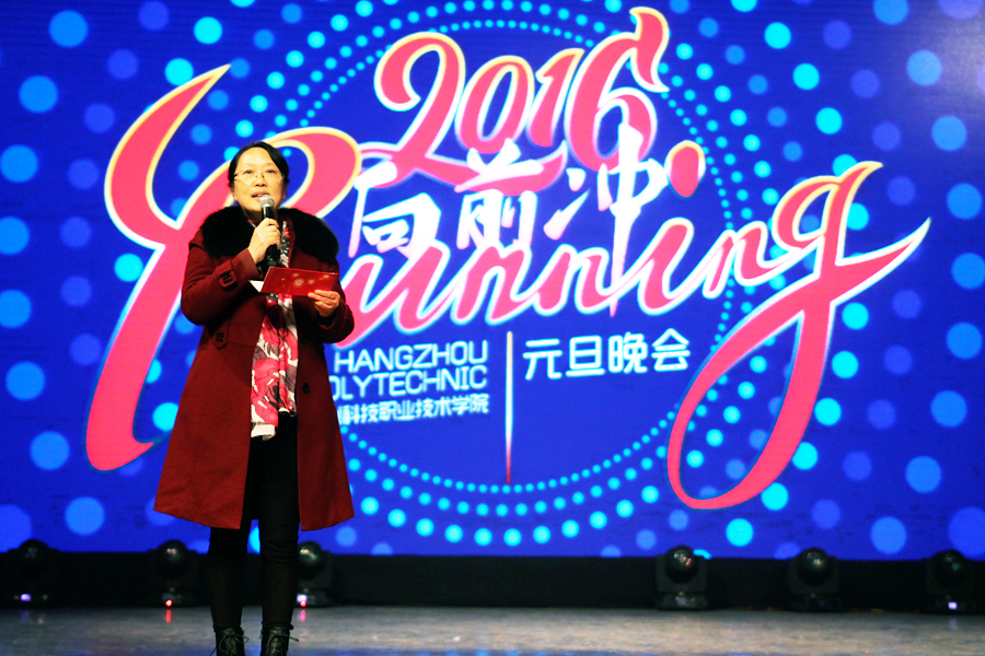徐红副校长在晚会现场发表了热情洋溢的新年致辞。她说:“2015年是我校全面深化改革的关键之年,是‘十二五’规划的收官之年,也是‘十三五’规划的谋划之年。回首2015年,我们共同分享喜悦、体会感动、承担责任。”徐校长肯定了2015年来我校在招生就业、国际交流、活动赛事等方面取得的成果,鼓励同学们用动听的歌声唱出心中的激情。