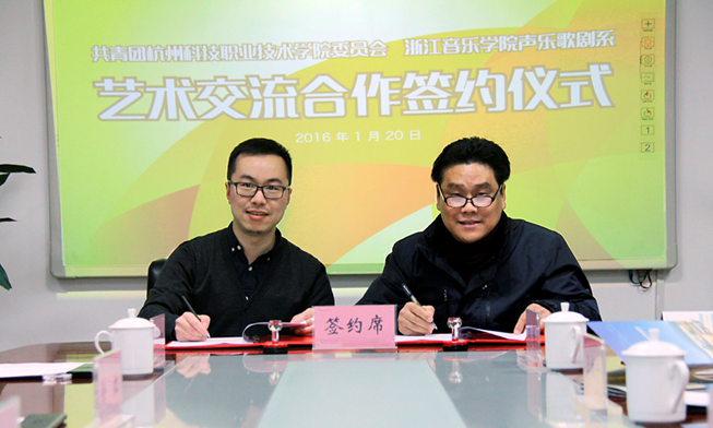1月20日,浙江音乐学院声歌系主任王维平、副主任李琳、办公室主任刘伟、办公室徐励成来访我校,与我校签订了艺术交流合作协议,共建“浙江音乐学院声乐歌剧系驻杭州科技职业技术学院教学实践培训基地”。副校长徐红代表学校热情接待了王维平一行,学工部、团委负责人,公共艺术教育委员会委员参加了签约仪式。