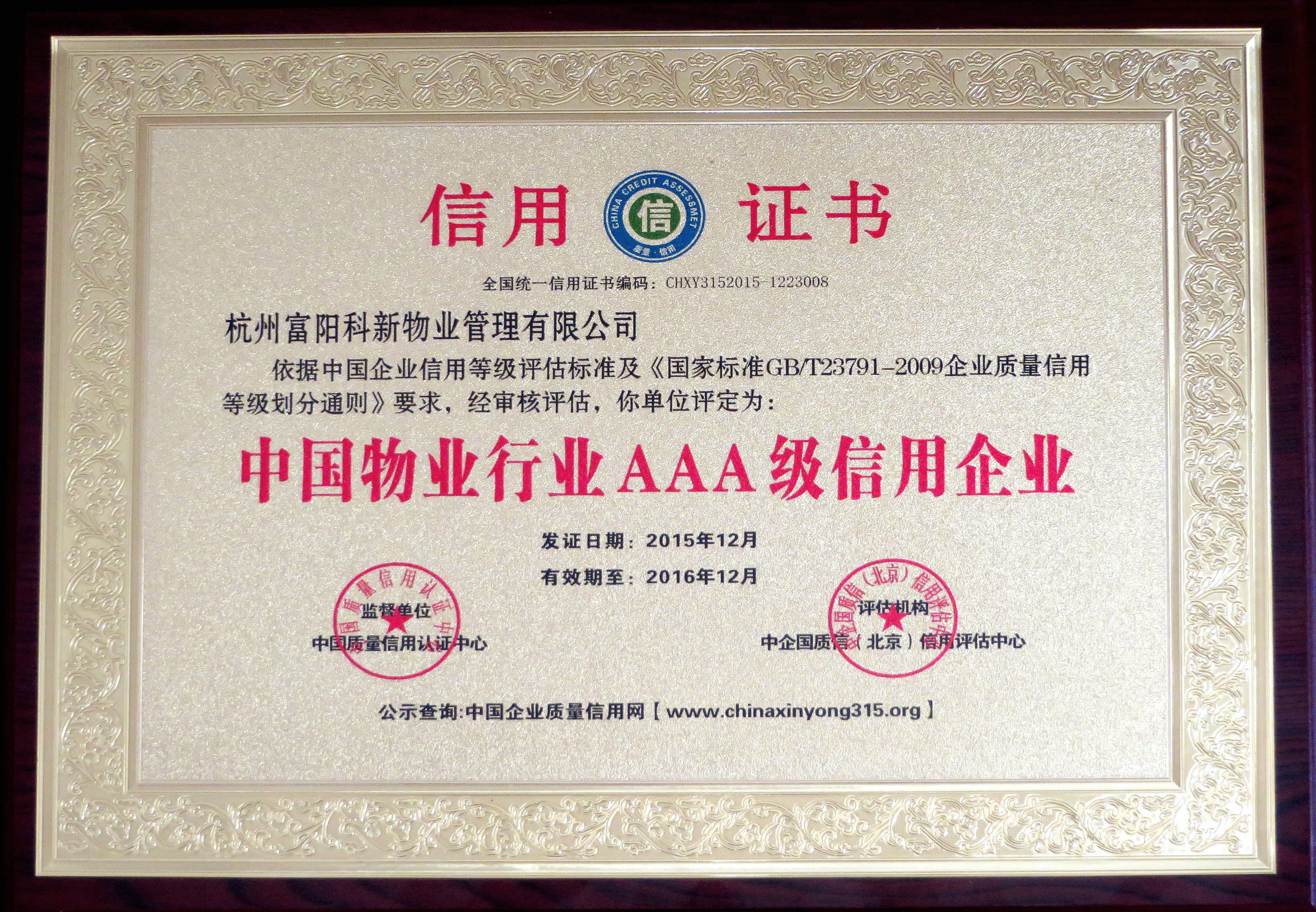 近日,我校直属企业杭州富阳科新物业管理有限公司荣获了“中国物业企业AAA级信用企业”荣誉称号。