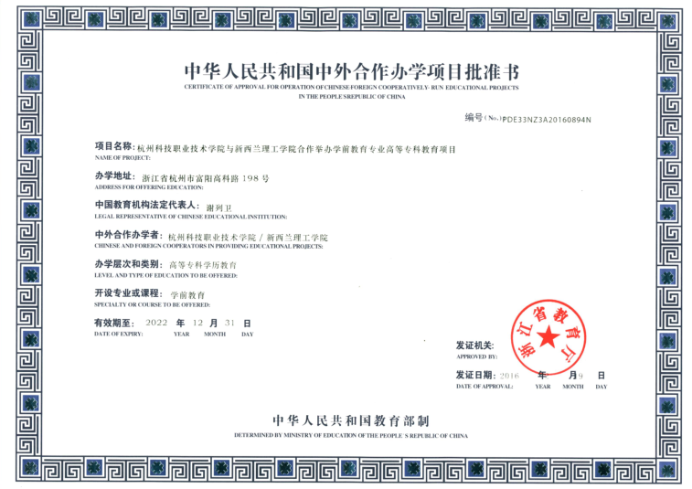 经省教育厅批准并报教育部备案,我校于2016年2月正式获得与新西兰理工学院(Unitec Institute of Technology)合作举办学前教育专业的资格。